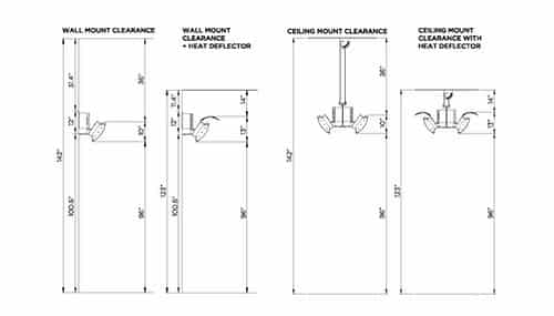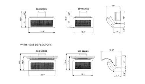 For low clearance areas, we recommend a heat deflector to protect the mounting surface. This accessory will also provide improved weather resistance and a more directional heat output.