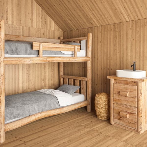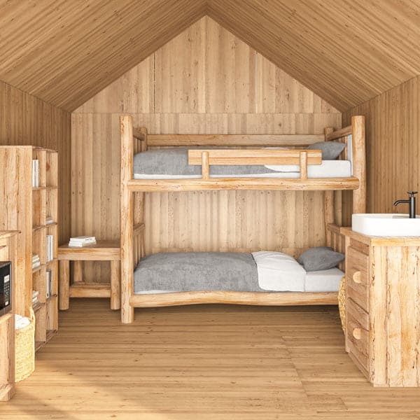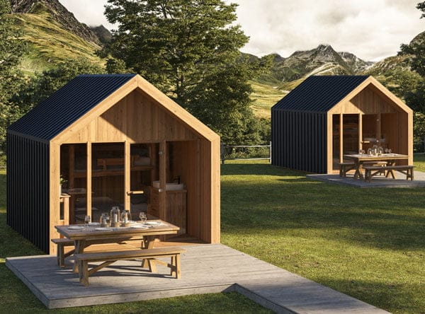 The Hudson Glamping Bunkie or Tiny Home combines the new modern appeal with black metal exterior siding and Western Red Cedar Interior. This model seduces you with its tempered glass front wall and door, also makes a great home office or gym. The optional Insulated walls and roof include 3″ (8cm) EPS Foam which is moisture resistant, meets LEED criteria, is 100% recyclable and has an R-Value of 11.25. The metal siding and trim is made with 28 gauge steel that is painted and has a 40 year warranty on the paint finish.