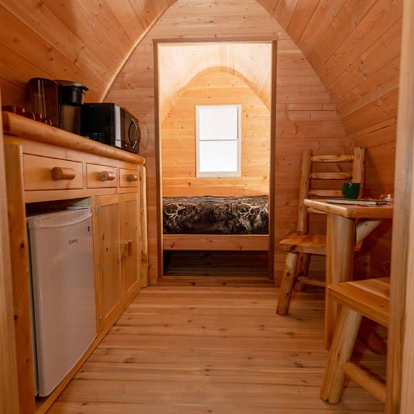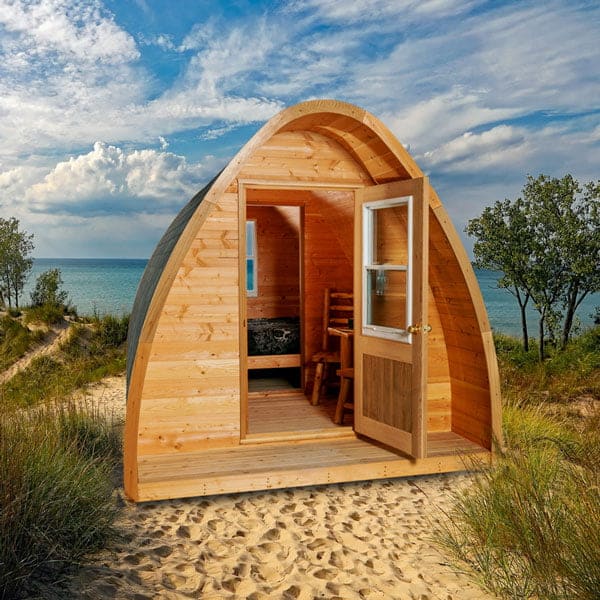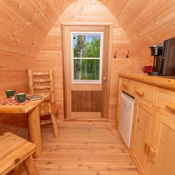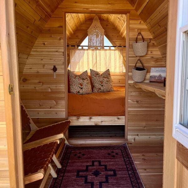 This glamping pod is wonderfully designed sleeping accommodation that is perfect for glamping, Airbnb or your cottage. The hand-crafted pod has a unique shape that provides lots of interior room with space for some amenities. The front door is 33″x71″ (84x180cm) and has an opening window with screens in it. The door can be locked for security or when not in use. The back half of the glamping POD has a built in platform that will fit a queen size mattress.