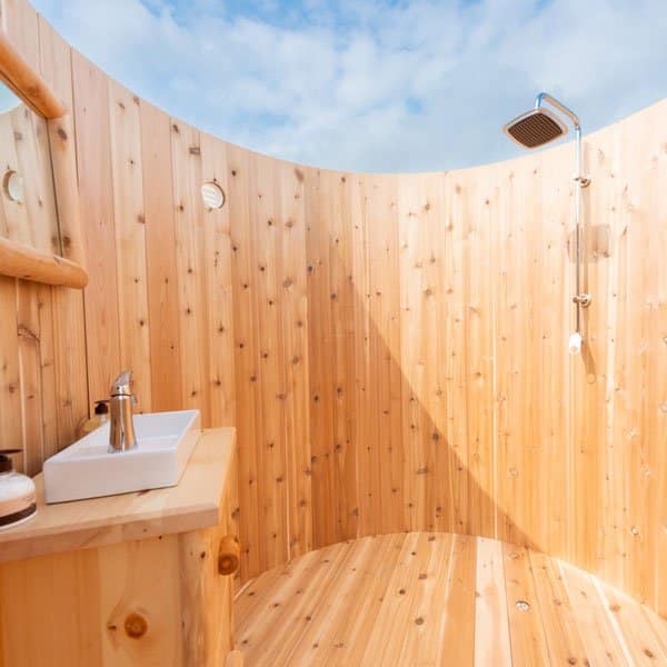 This unique Outdoor Barrel Washroom with an acrylic roof measures 7′ diameter and 106″ total height. The kit is manufactured with knotty western red cedar walls and floor and is easy to assemble in 4 hours or less. Customize this unit with our optional interior walls, 2 drawer vanity, wall mount mirror, Shower fixtures and other options. We do not provide electrical or plumbing in the washrooms, this is up to the customer to add as they feel is required in their situation.