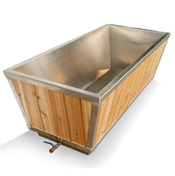 The optional roll up cover will keep your water clean when not in use and an easy to use drain, that will connect to any garden hose, is included with all cold plunge tubs. The total outside measurement is 71″x33″x25″ High with angled sides for easy in and out access and holds 190 gallons of water.