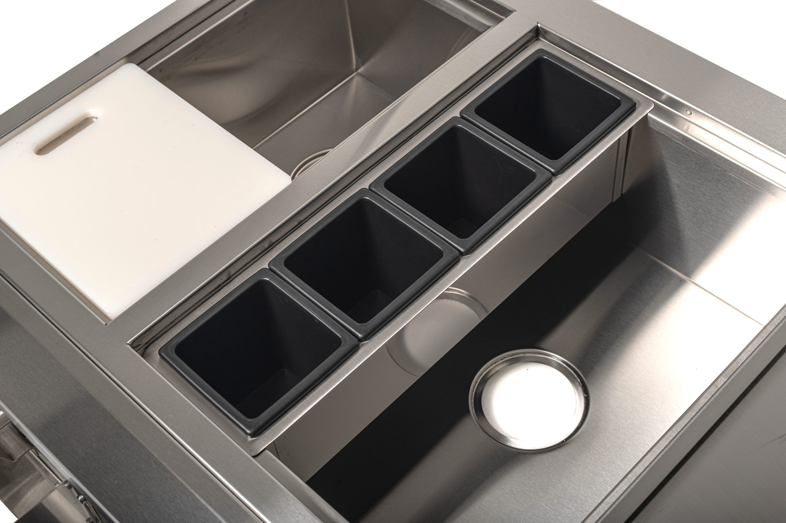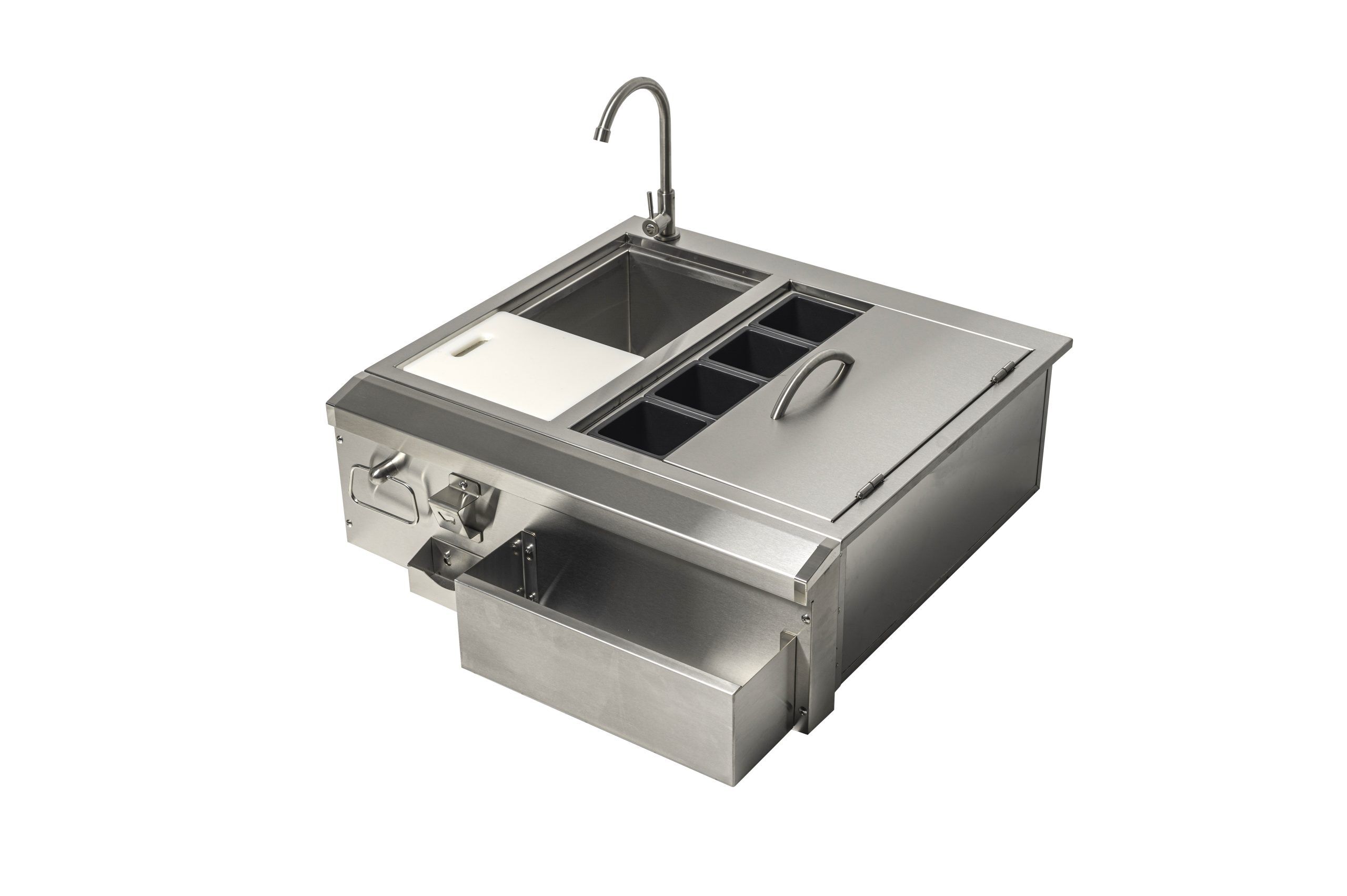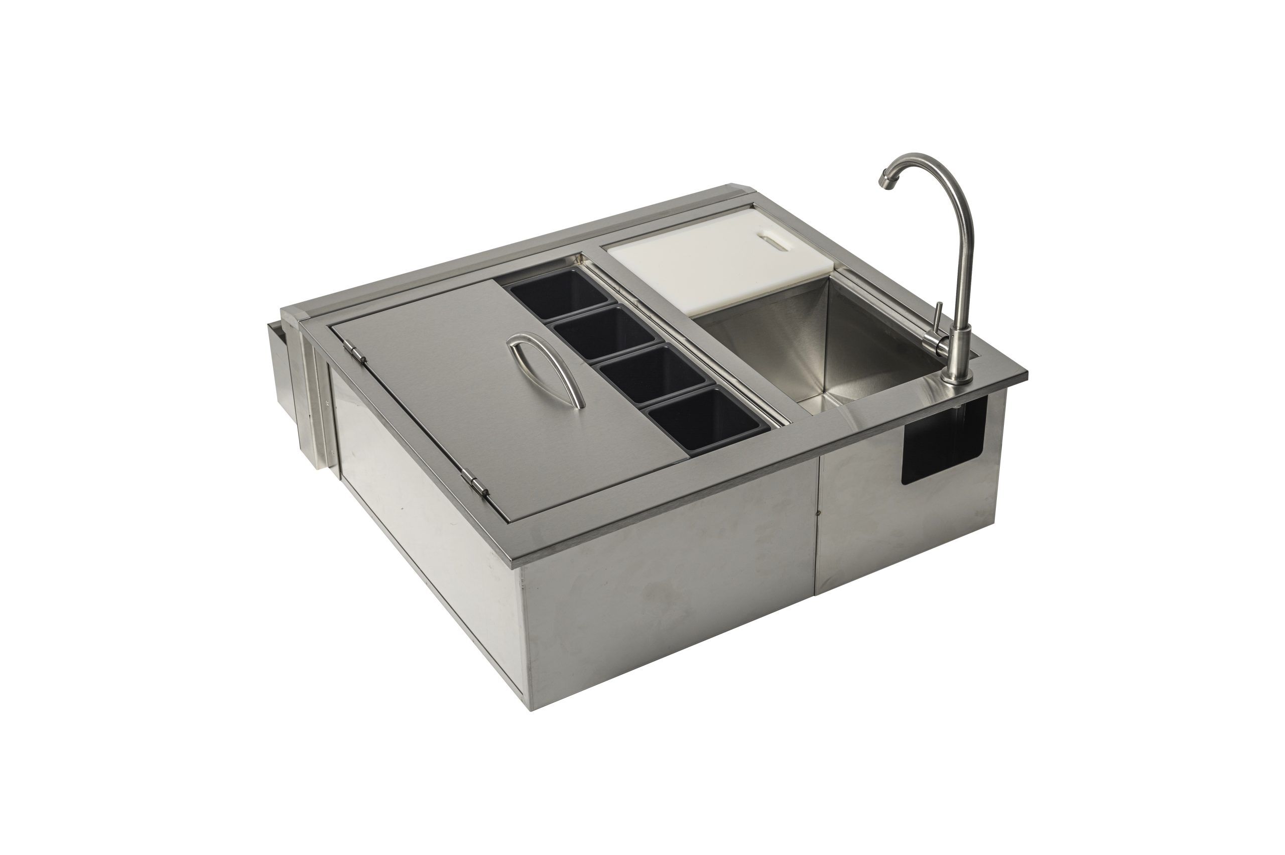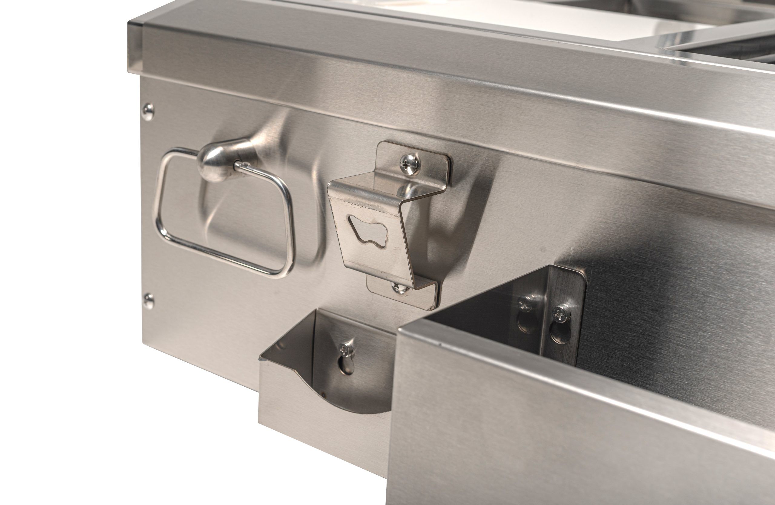The Jackson Grills 30″ Built-In Cocktail Center is constructed out of stainless steel. Assembled as a complete package, the unit includes a large ice chest with stainless steel cover, a sink, speed rail front bottle storage, bottle boots for chilling mixes, a cutting board, a bottle opener, a towel holder and a cold water tap.