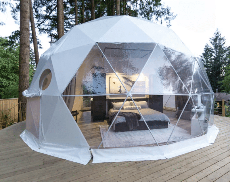Our off-grid eco-friendly tents can be set up in any location with minimal impact on the surrounding environment. They are designed to run entirely off the grid with an optional solar-powered ceiling fan and wood stove. Moreover, they can also be wired with electricity if you prefer. All of the Backyard Canada Geodesic Domes are built with high-quality materials and components, which should last over 15 years if looked after well. We also carry spare PVC covers in case of emergencies.