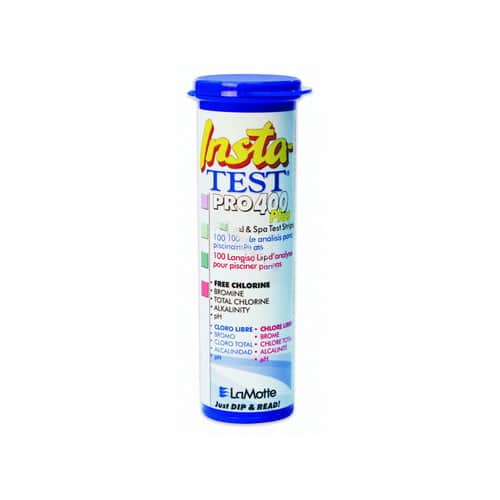 The Insta-TEST® Pro 400 Plus pool & spa strip measures Free Chlorine 0-10 ppm, Bromine 0-20 ppm, Total Chlorine 0-10 ppm, Total Alkalinity 0-240 ppm, pH 6.2-9.0, and Total Hardness 0-800 ppm.Perfect for Most Important Test Factors!Free Chlorine, Bromine, Total Chlorine, Alkalinity, pH, Total HardnessThe Insta-TEST® 5 Plus pool & spa strip measures Free Chlorine 0-10 ppm, Bromine 0-20 ppm, Total Chlorine 0-10 ppm, Total Alkalinity 0-240 ppm, pH 6.2-9.0, and Total Hardness 0-800 ppm.This test strip is a dip-n-read strip with instant results. Each bottle includes 100 test strips packaged in a waterproof PopTop bottle with hinged cap. The bottle has a molded desiccant liner, which protects the strips from moisture and UV light. This product can be purchased with English only text or trilingual (English, Spanish, French) instructions.Test FactorRangeFree Chlorine 0, 0.5, 1, 3, 5, 10 ppm Bromine 0, 1, 2, 6, 10, 20 ppm Total Chlorine0, 0.5, 1, 3, 5, 10 ppm Alkalinity 0, 40, 80, 120, 180, 240 ppmpH6.2, 6.8, 7.2, 7.8, 8.4, 9.0 Total Hardness 0, 100, 250, 450, 800 ppm