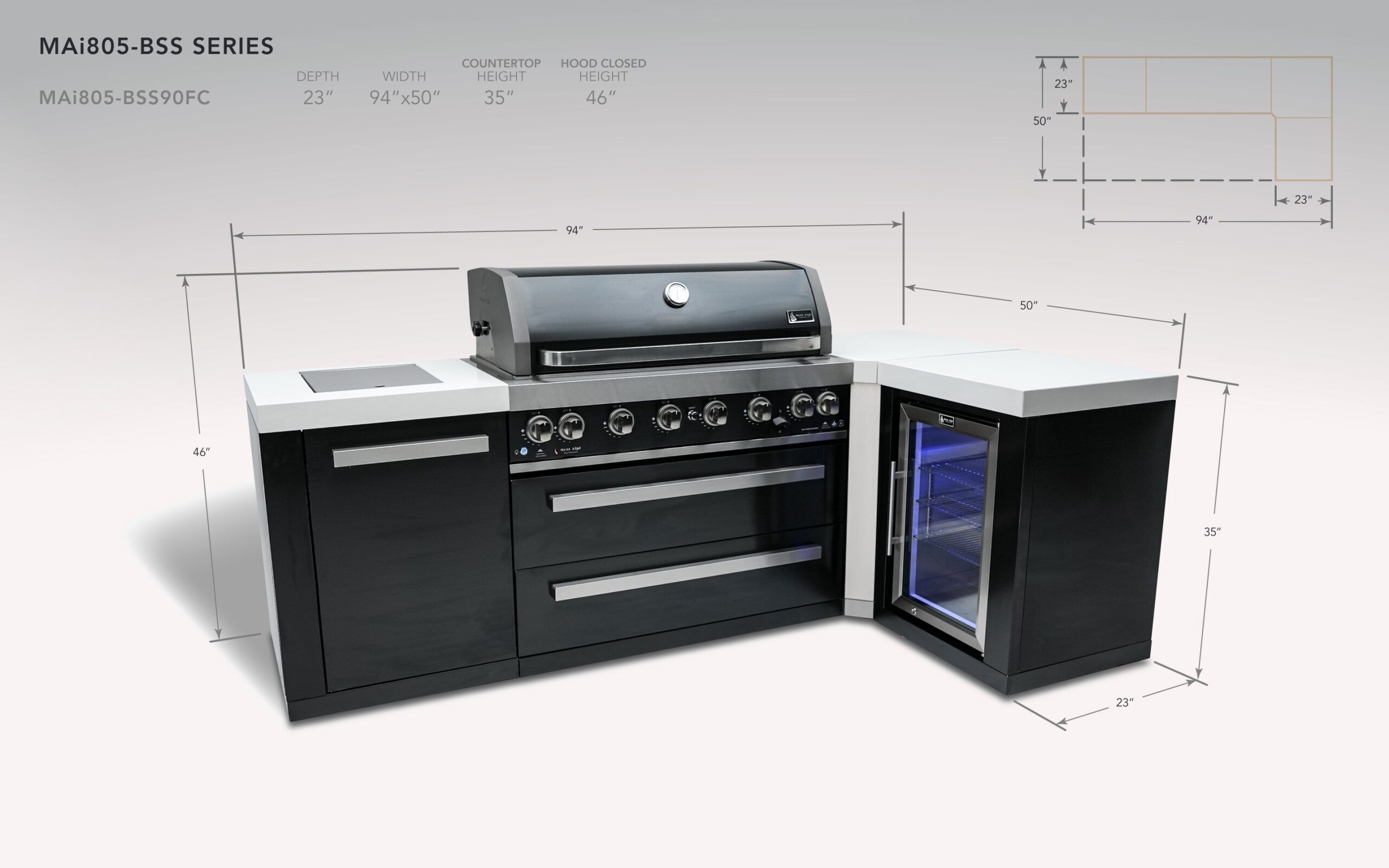 The Mont Alpi Black stainless steel series is the perfect combination of the longevity of stainless with the style of black. This grill combines six burners of standard cooking size along with an extremely useful infrared side burner suitable for searing, pan frying and boiling and an infrared rear burner for the ultimate rotisserie experience, inclusive with a heavy duty rotisserie kit. The 90 degree fridge module is the perfect fit for right angles and tighter spaces and adds a beautiful outdoor rated refrigerator, perfect for hot days, good food and ice cold beverages.