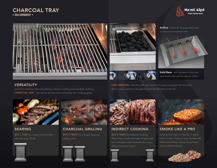 The Mont Alpi original series includes granite counters for easy cleaning and extra class! Be sure to check out the useful optional accessories such as the heavy duty rotisserie kit, charcoal tray and steel griddle. The grill comes configured for propane, and ready to be converted to Natural gas in just a few minutes, simply add the Mont Alpi Natural gas conversion kit.