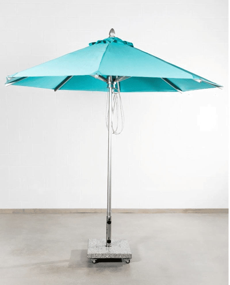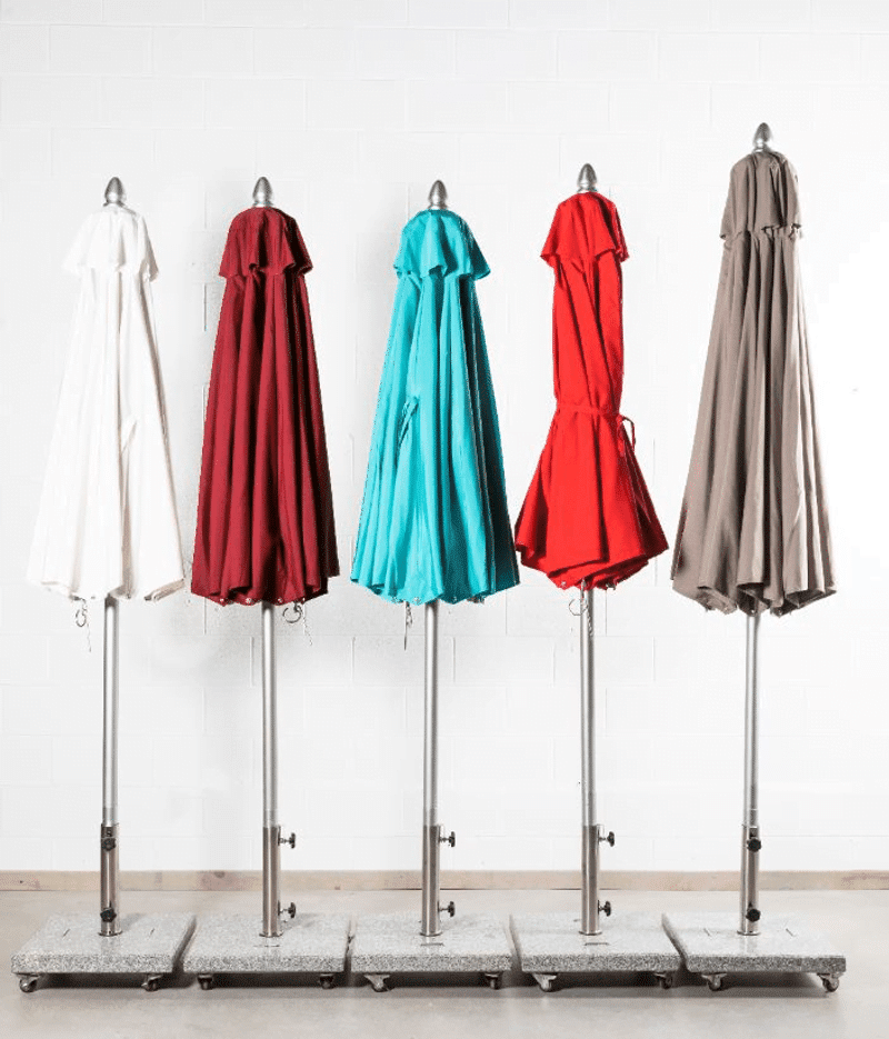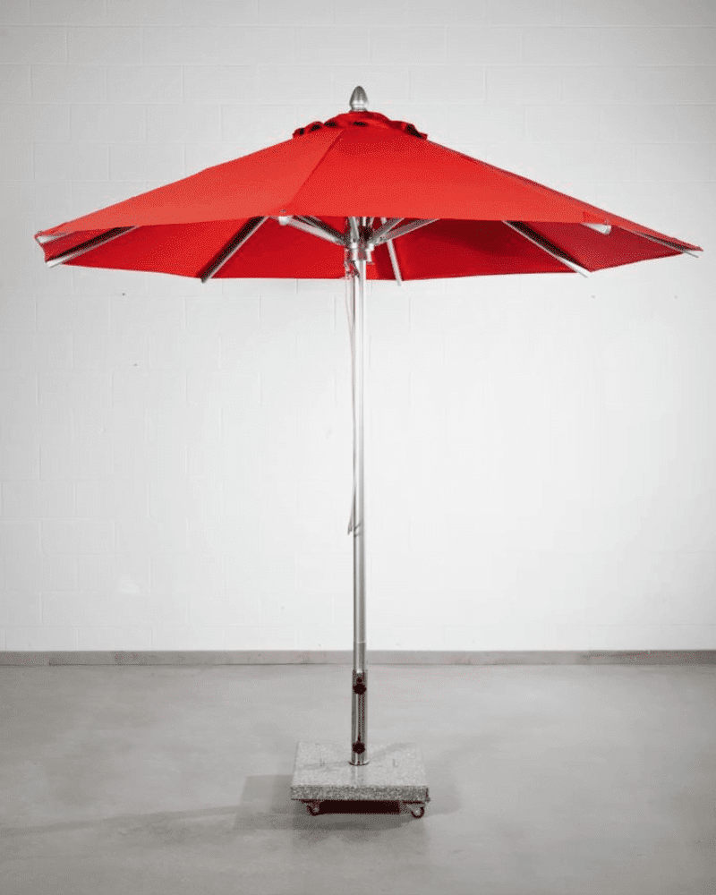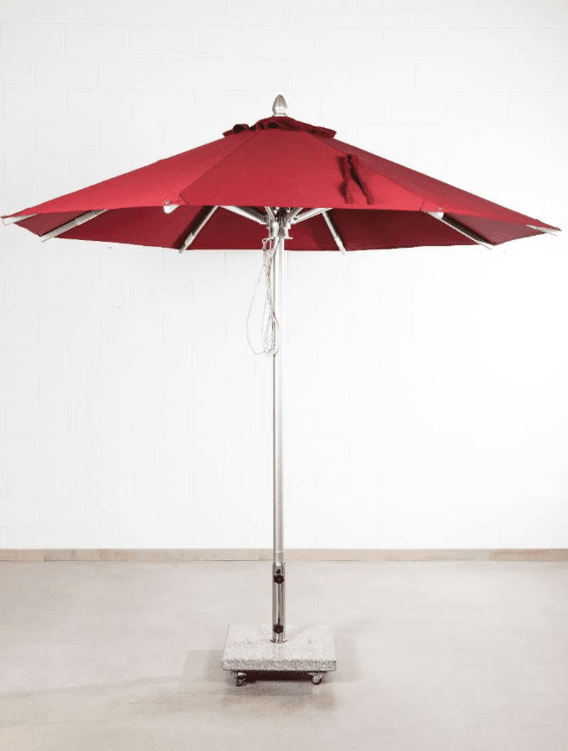 These beautiful umbrellas, made from Sunbrella fabric come in 2 sizes, 2.5M or 3M, and a variety of colours: Natural, Taupe, Burgundy, Logo Red and Aruba. The Granite Umbrella Base, with wheels, is available in 2 sizes, 35kg and 52kg. Posted price includes a 2.5M Umbrella and 35kg base.