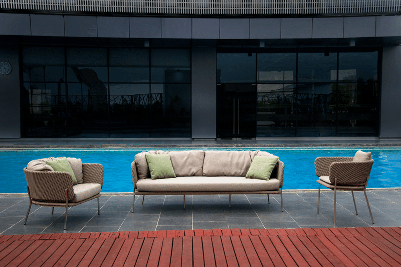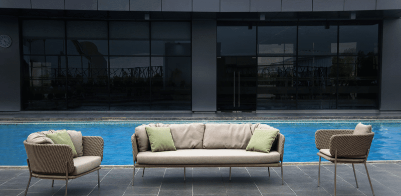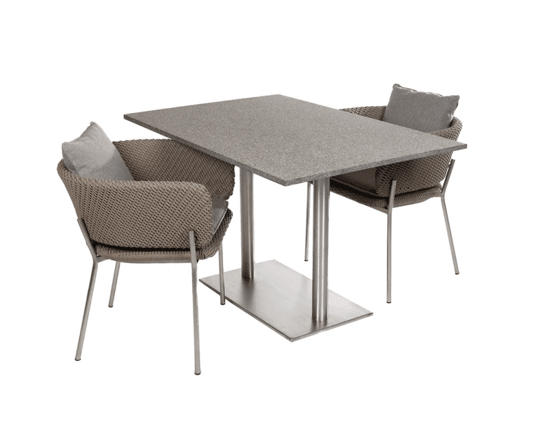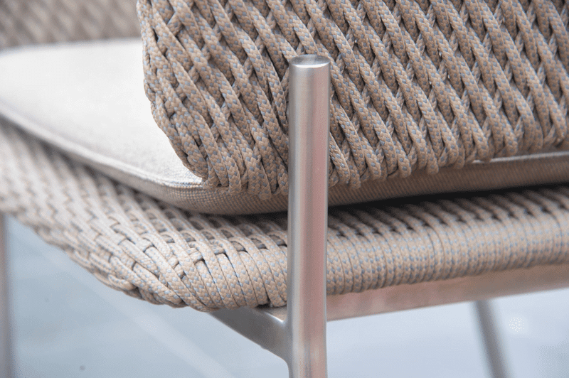 The Catalina Collection is made from stainless steel and Yarn Grey/Black & Beige/Beige & Ivory Rope. The cusions are Subrella Blend Fog. Posted price includes the Sofa and Loung Chair.