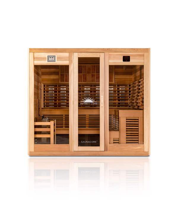 A premium infrared sauna and traditional sauna in one! This is what many of you have been looking for. The ultimate sauna! The Sauna, Infrared Panels, and Traditional Heater are all Made in Canada meaning impressive quality and industry leading quality and safety standards. Available in indoor and outdoor versions, this beautiful infrared sauna and traditional sauna ensures you’re getting all of the potential health benefits from sauna bathing. Infrared is known for deep sweat that helps cleans your body of heavy metals. Many fire departments have implemented infrared saunas as part of there post call decontamination protocol to help ensure the long term health of their members.