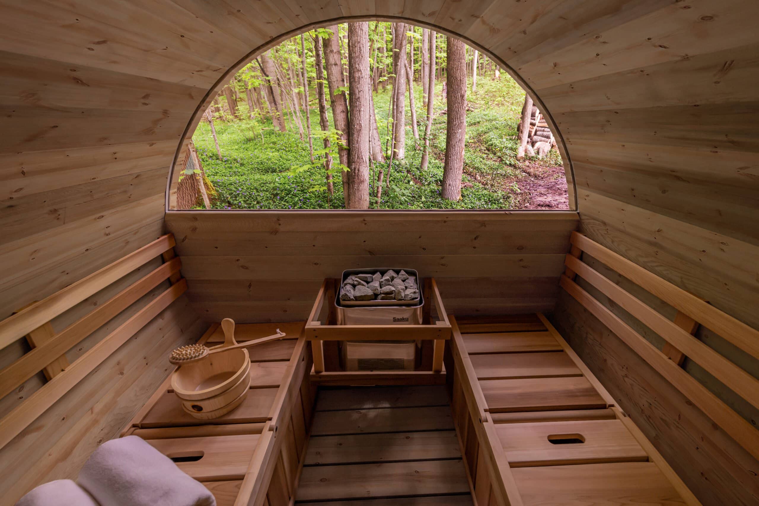 Expanding to as large as 7′ wide x 8′ long for 6 to 8 people, our saunas can be customized with a 2′ porch and/or a 4′ change room. We also offer a small overhang cove, that’s great for keeping the snow off the front door. Additional options recommended include the “Signature Interior Package” that includes upgraded bench construction for more comfort and a flat floor. And if you’d like more light and view, we have bronzed window options and lights. The pictures show most of the available options, so you can better understand what’s available.
