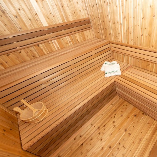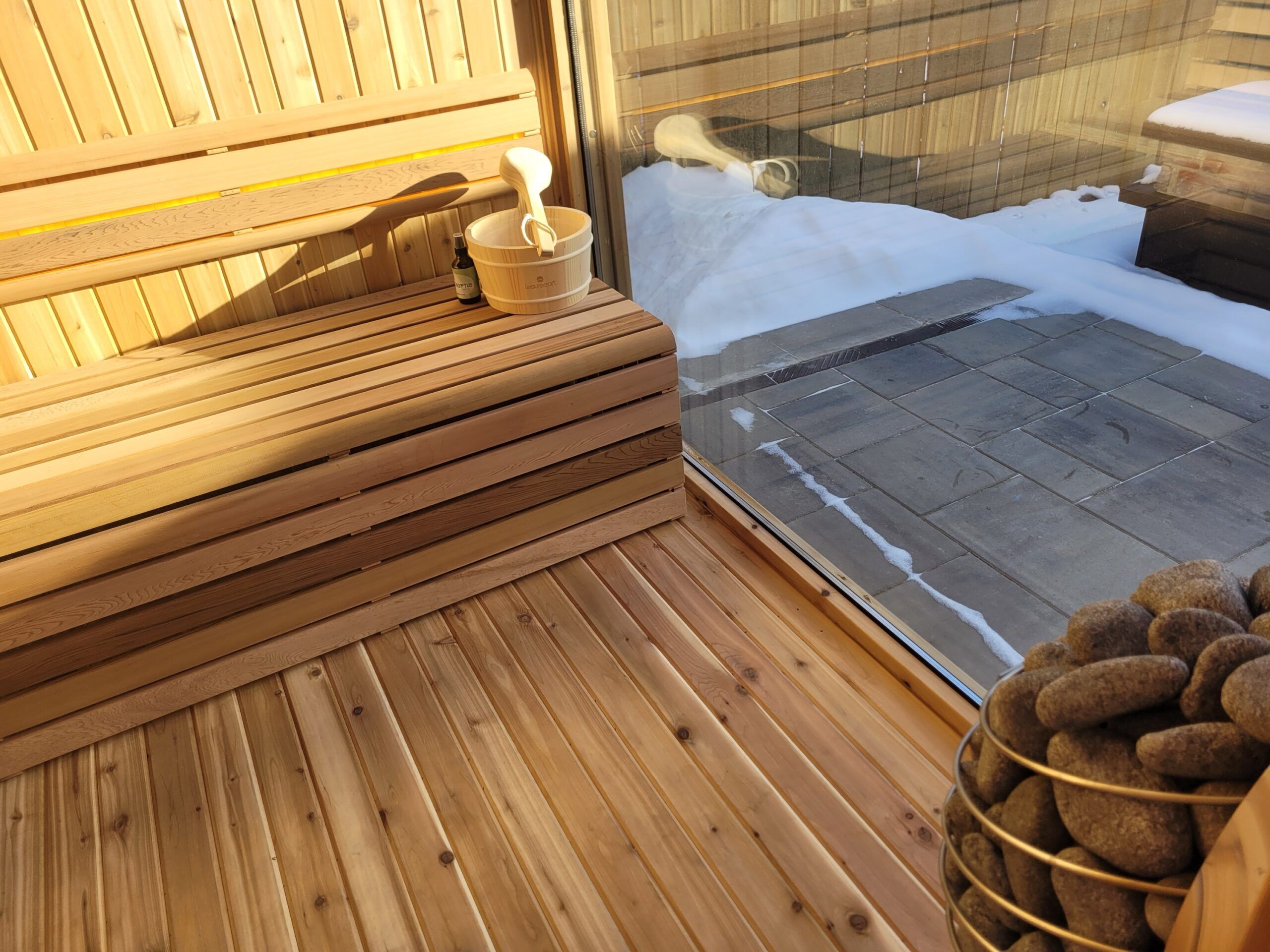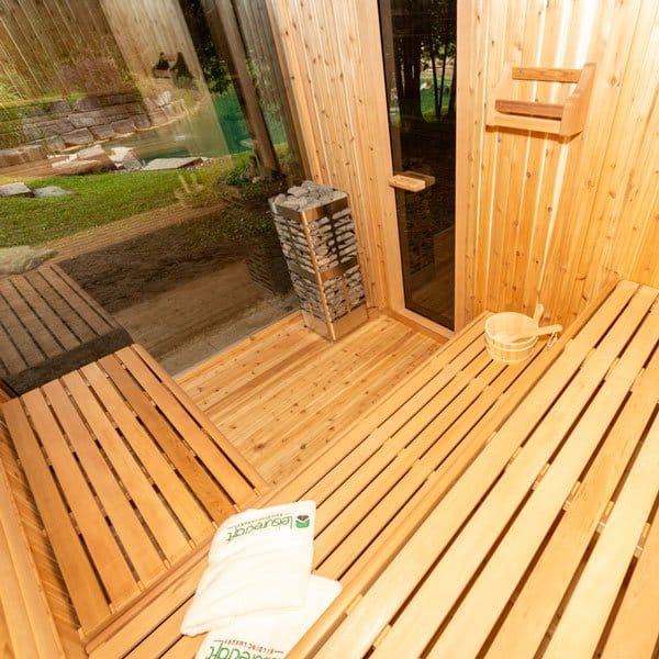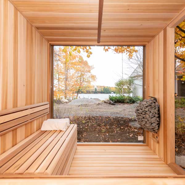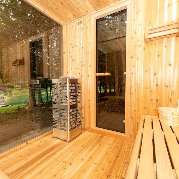 The Pure Cube Neptune Sauna model brings the outdoors inside with its large glass front wall. Surround yourself with nature in this spacious interior with fully insulated floor, walls and roof this modular sauna kit is easy to assemble in any location. The black metal siding on the outside, EPDM on the roof and clear western red cedar interior makes this a characteristic and modern outdoor sauna to complement the Pure Cube Collection by Leisurecraft.