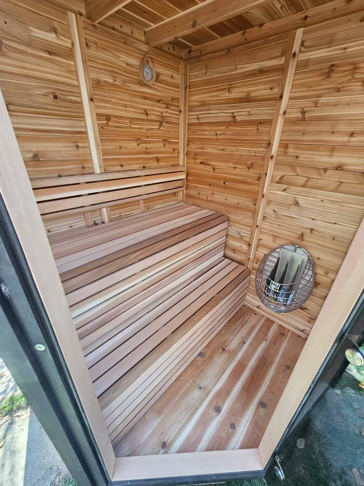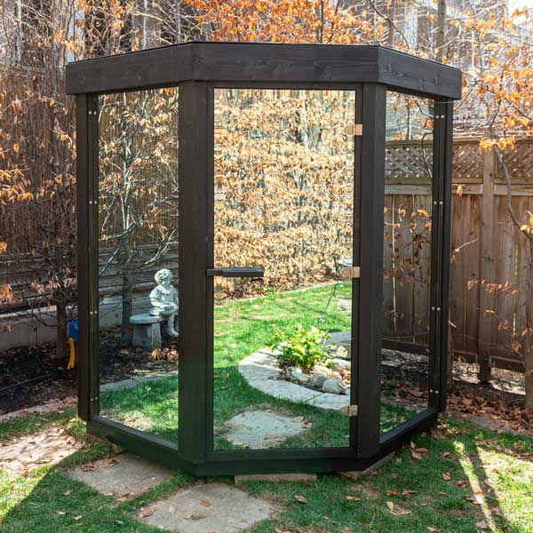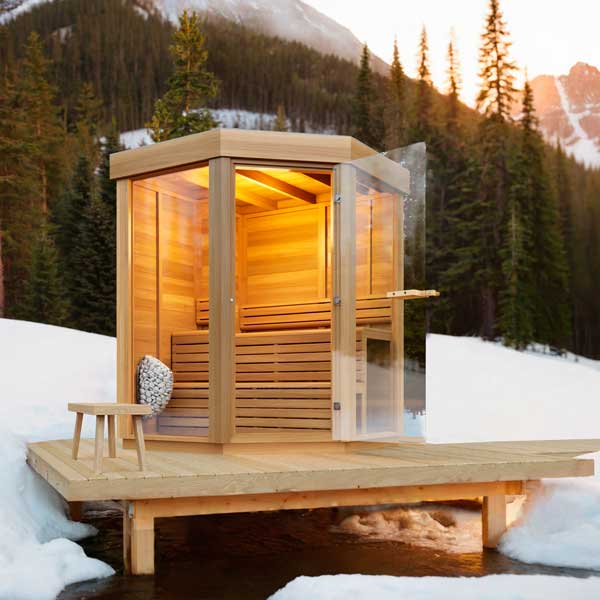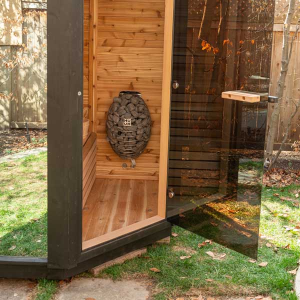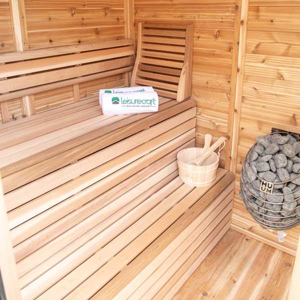 The Backyard Canada Dundalk Leisurecraft PureCube Trinity Outdoor Sauna is one of the newest additions to the lineup. The Pure Cube Trinity Sauna is a 5 Sided Corner model that will comfortably seat 2 people and fit onto a small deck or patio at your Condo or Cottage! Made with western red cedar and tempered glass windows this model as a specially designed flat EPDM rubber roof tray for year round use. Product images also show Trinity stained in black, this is done by the client after construction, and stain is not included.