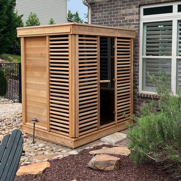 The Pure Cube CU572 Outdoor Sauna in Backyard Canada’s most popular sauna. It’s just the right size, with a complex and stunning design that features a full glass door between the large double pane bronzed window panels on the front wall. Revamp your outdoor entertainment area with optional semi-privacy panels that still feature the double pane tempered glass with a fixed cedar grill on the outside. Or choose to move the door around the corner and switch glass for solid cedar. Whatever works best in your space. Available Options: Choose door and glass location, contact us and reference the sauna to discuss the options.